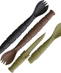 The Field Kit Spork Set is perfect for camping, hiking, picnics, storing in gloveboxes and packs, and eating on the go. Made from food and water safe Creamid®, the Sporks are dishwasher safe. The Sporks feature a spoon/fork combination at the base and a serrated knife internally. The knife is accessed by pulling on both ends of the Spork. The overall length of each spork is 6.875”. The blade length of the knife is 2.5”. Made in the USA.