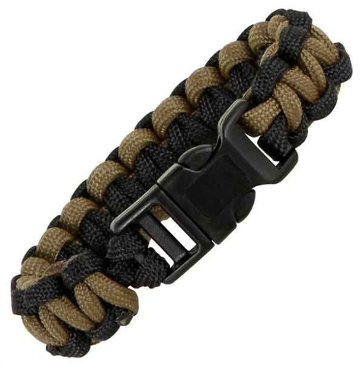Knotty Boys Survival Bracelet – Single Weave. 8″ diameter (medium size). Hand tied nylon cord. Enables you to carry several feet of nylon cord that can be used in an emergency for countless survival applications. One inch of wrist diameter equals approximately one foot of cord. 5/8″ release buckle. Bulk packed. Color: Black and coyote brown.