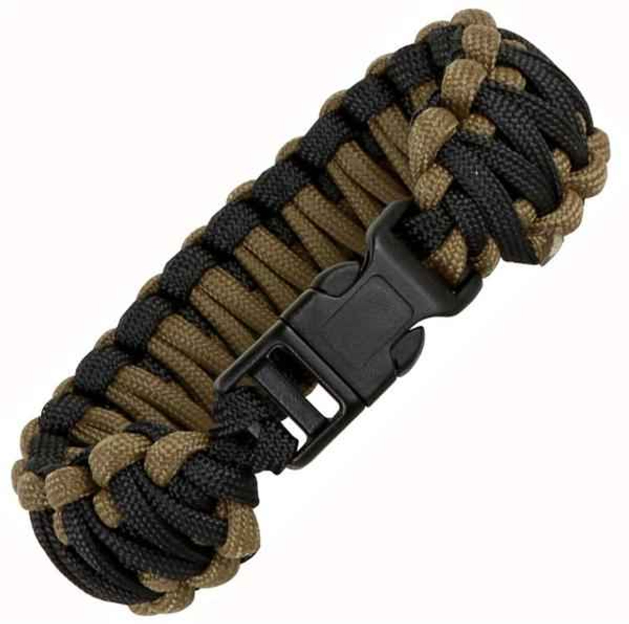 Knotty Boys Survival Bracelet Fat Boy style. Size: Large (9″ diameter). Color: Coyote brown and black. Hand tied nylon cord construction. Enables you to carry several feet of nylon cord that can be used in an emergency for countless survival applications. One inch of your wrist diameter equals approximately one foot of cord. 5/8″ release buckle