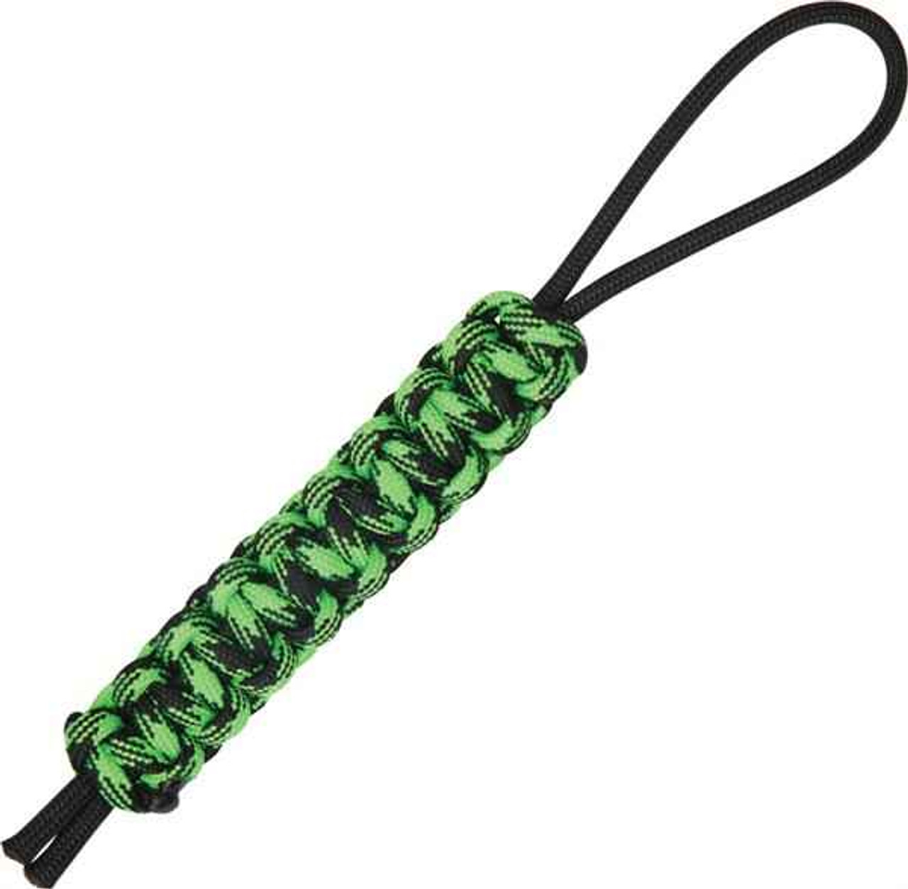 Knotty Boys Zombie Lanyard. Neon green and black hand tied parachute cord construction. Works great on keys to assist drawing them from the pocket or sheath. May also be attached to zippers or a keychain. Hang packaged with slogan “Get your ZOMBIE or Go Home!”