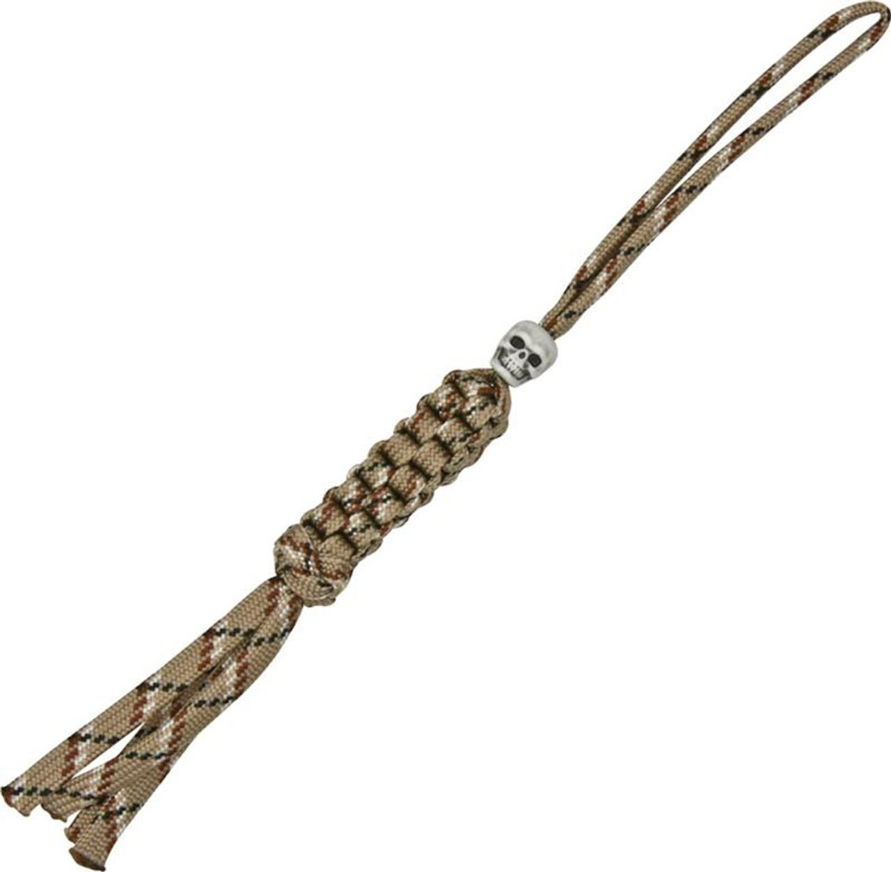 Para Cord Lanyard – Desert Camo. Hand tied parachute cord construction with decorative skull bead. Works great on knives to assist drawing them from the pocket or sheath. May also be attached to zippers or a keychain.