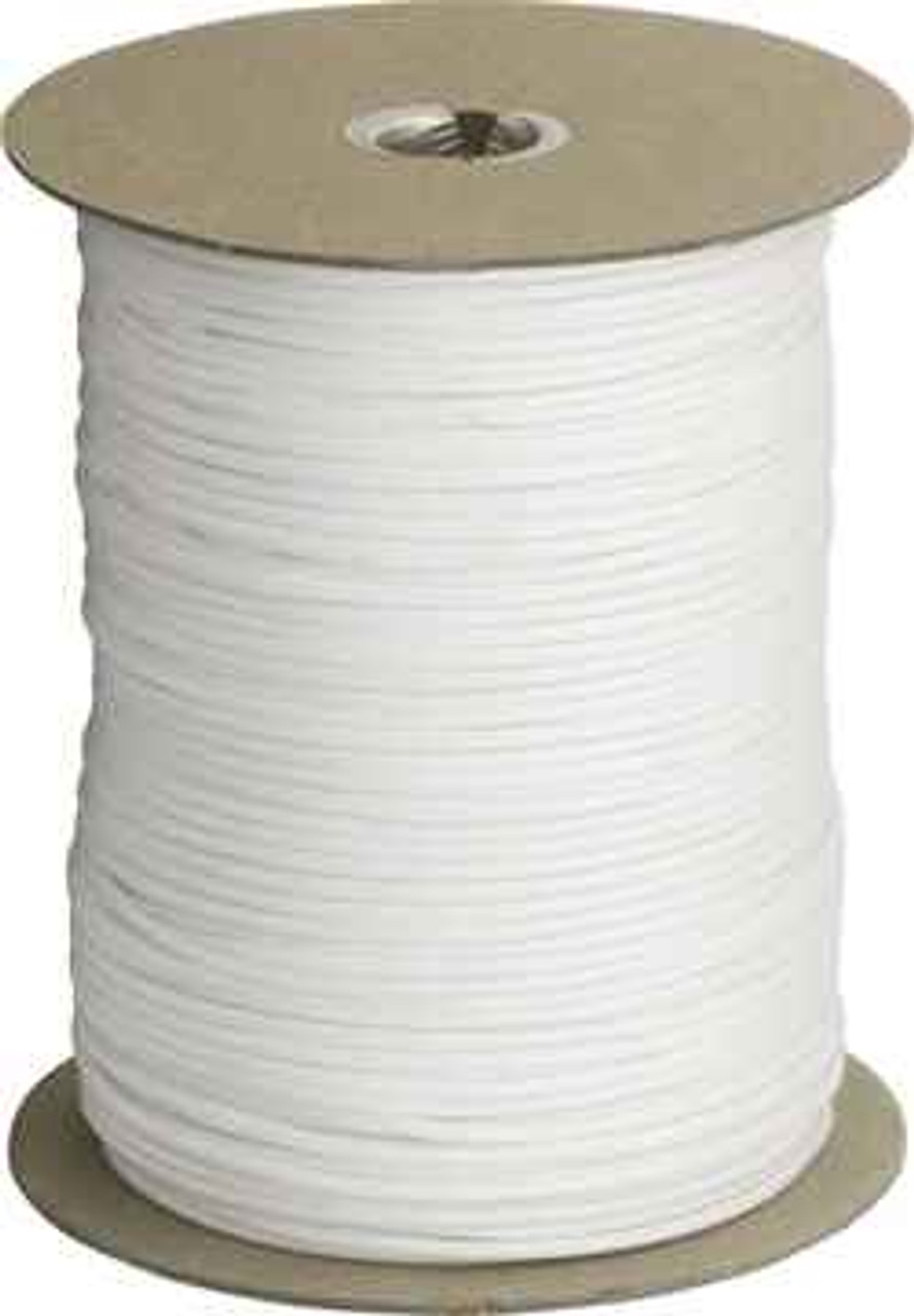 Parachute Cord. White nylon construction. 1000 ft. length. Ideal for camping, boating, crabbing, indoor and outdoor clotheslines, halyard lines, garden lines, venetian blinds, awning lines and many applications requiring strength and durability.