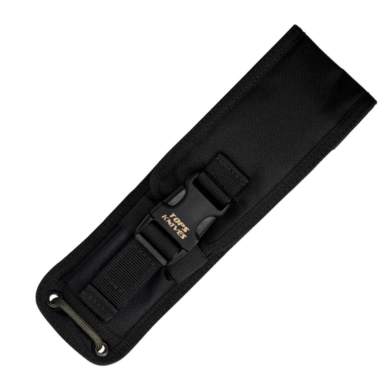 TOPS XcEST Bravo (Cross Country Emergency Support Tool) has a 440C stainless hunter point blade with black traction coating, sharpened top edge and thumb ridge. Full tang. Brown canvas micarta handles with a strong divot cut for fire starting. Handles can be removed to store extra small items. OD green lanyard. Tactical black ballistic nylon belt sheath with protective insert, leg ties and removable flap cover.