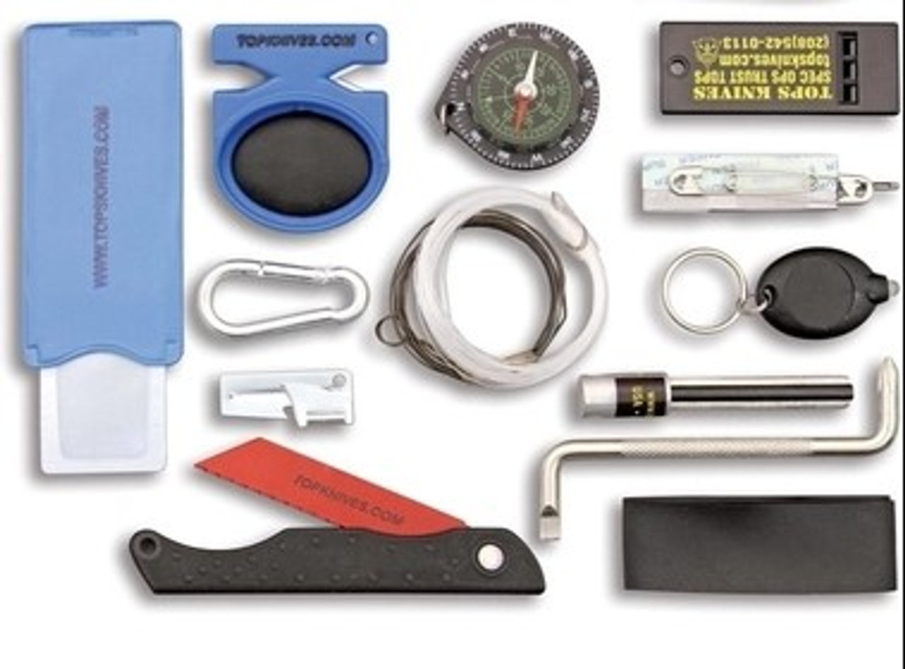 - TOPS Survival Kit – survival saw, Lansky sharpener, (2) Ranger bands, compass, fishing line, (2) fishing hooks, offset screwdriver with flat and Phillips head, P-38, snare wire, white LED light, sail needle, fire starter, razor blade, snap link, (2) safety pins, emergency whistle and magnifier