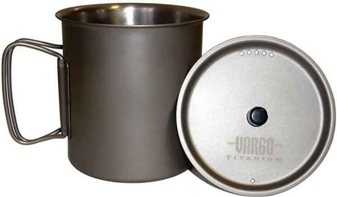 Vargo Outdoors Ti-Lite Mug. 750 ml capacity. Measures 4.5″ high x 4.2″ deep. Titanium construction for lightweight durability. Strainer lid with an easy-to-grip heat-resistant knob to prevents burns. Attached foldaway handles for cooking and packing ease. Large enough to cook single entree meals, yet small and compact enough to enjoy an early morning cup of coffee. 32 oz. water bottle fits inside to make packing easier. Nylon mesh storage bag included. Weighs 4.8 oz. (137 grams).