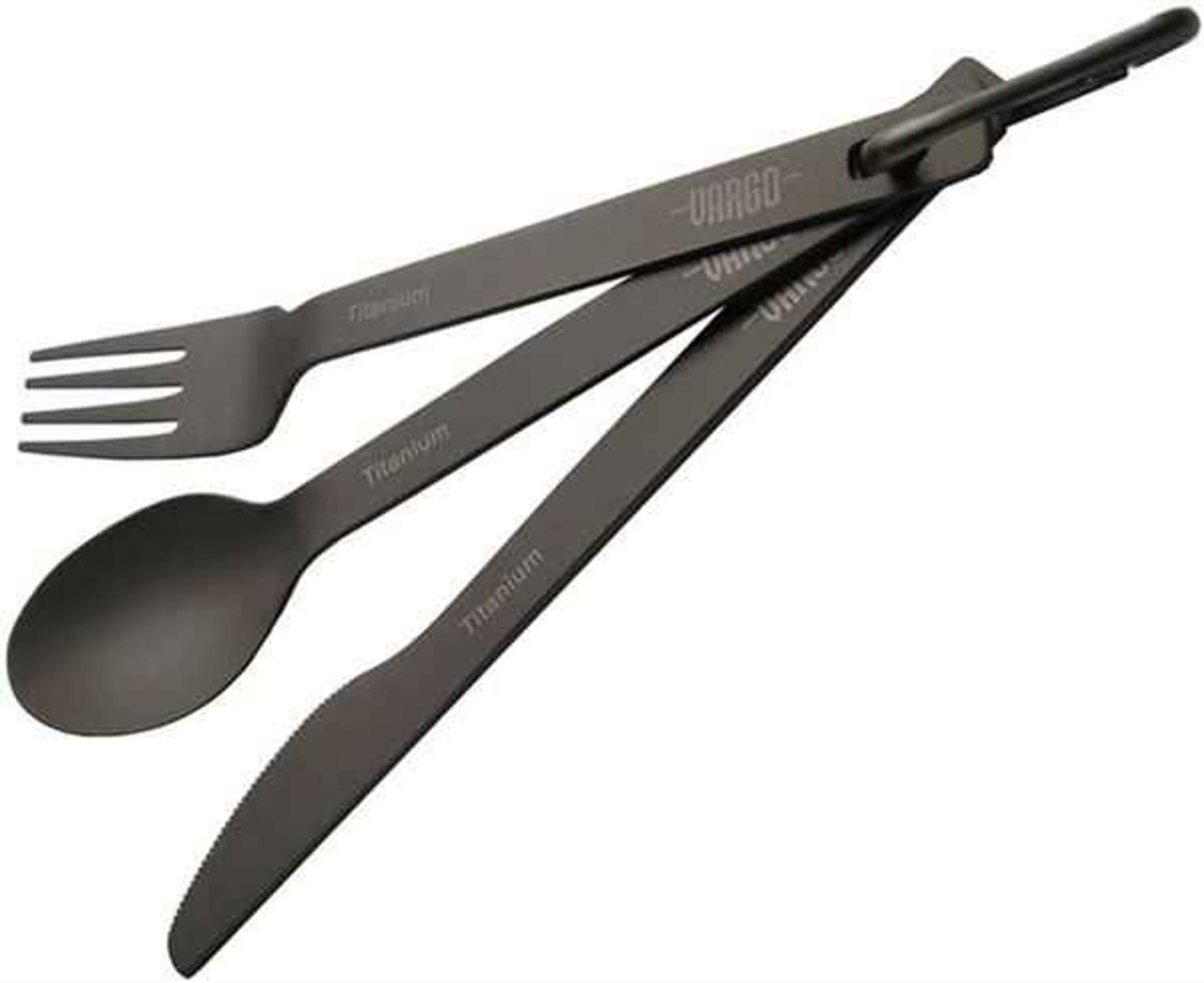 Vargo Outdoors Titanium Spoon/Fork/Knife Set. Ultra Light Version. Each measures 6 1/4″ overall. Matte finish. All three pieces held together with attachment clip. Weight: 1.3 ounces (37 grams).