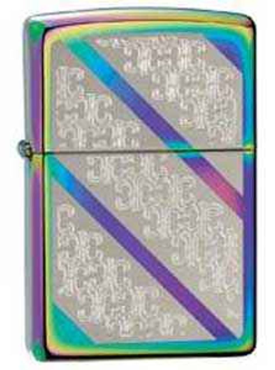 Intricate engraving in a diagonal striped pattern sets off multi-hued Spectrum finish. Genuine Zippo windproof lighter packaged in a cardboard gift box with the famous Zippo lifetime guarantee.