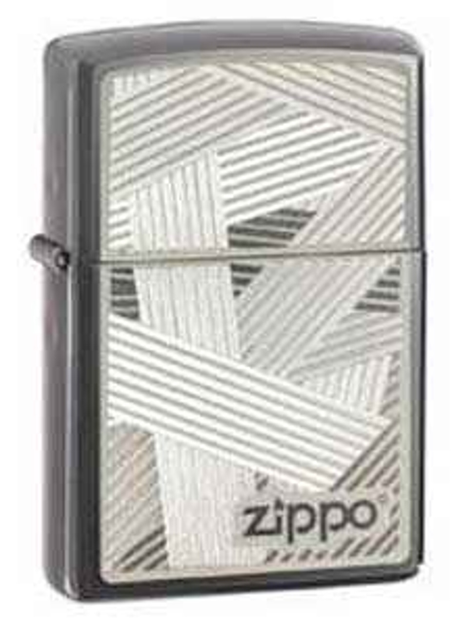Handsome Black Ice imprinted with crisscross patterns and Zippo logo. Genuine Zippo windproof lighter packaged in a cardboard gift box with the famous Zippo lifetime guarantee.