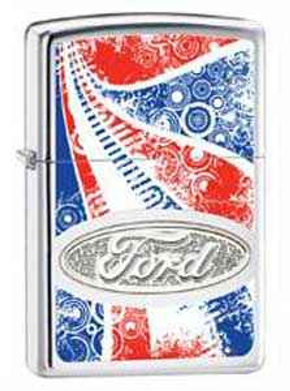 A double lustre Ford oval logo is set against a colorful red, white, and blue background for a contemporary Americana theme. Genuine Zippo windproof lighter packaged in a cardboard gift box with the famous Zippo lifetime guarantee.