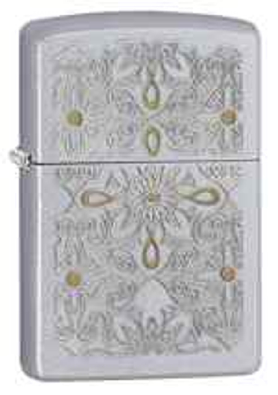 Catch someones eye with this attractive Satin Chrome windproof lighter. An engraved floral design with gold accents allows this lighter to grab everyones attention when you spark up this lighter. Comes packaged in an environmentally friendly gift box. For optimal performance, use with Zippo premium lighter fluid.